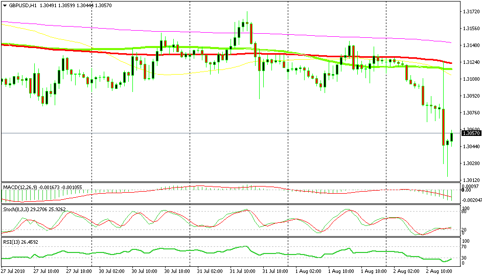 The statement acknowledged the higher inflation and the economic pickup in Q2 after the soft numbers in Q1. But the BOE brushed the weak Q1 numbers aside saying that it was a one-off after the strong Q4 last year. But, the Brexit process is a major negative event which could derail the UK economy, said the statement and the GBP reversed immediately after having jumped 40 pips higher on the unanimous vote to hike interest rates. BOE Chairman Mark Carney added that the trade war will likely hurt the investor sentiment on a global scale which is another major event which could materialize negatively for the UK economy. The pound lost nearly 100 pips after Carney’s comments. Now the GBP has entered a bearish phase.