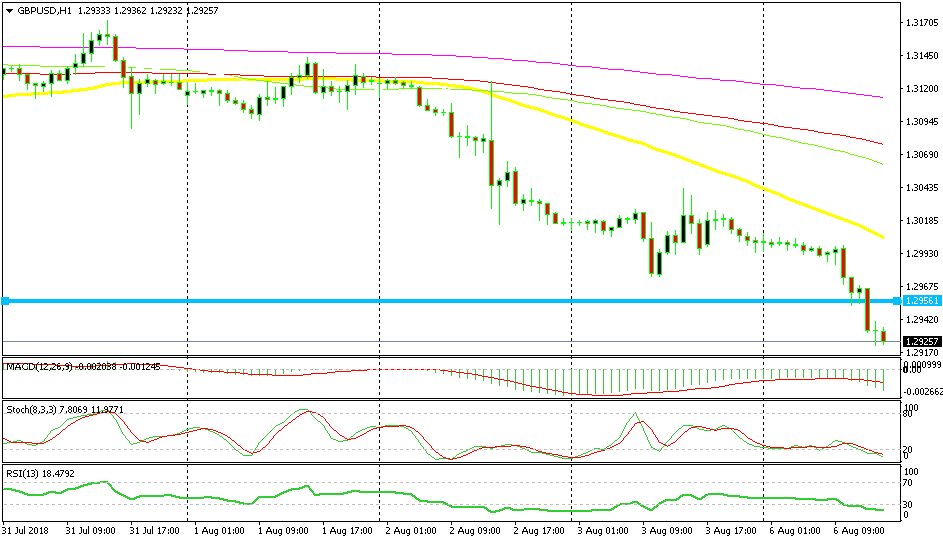 GBP/USD turned bearish after Mark Carney’s speech last Thursday. He made it clear that there won’t be any more rate hikes soon and the GBP sellers got activated. The fundamentals were dovish and the trend was bearish until then, but it has picked up pace since Thursday and today the support at 1.2950s was broken. I could sell right now but I like to sell retraces during a downtrend. So I will wait for the price to retrace higher, probably to the previous support at 1.2950s, which will likely turn into support now.