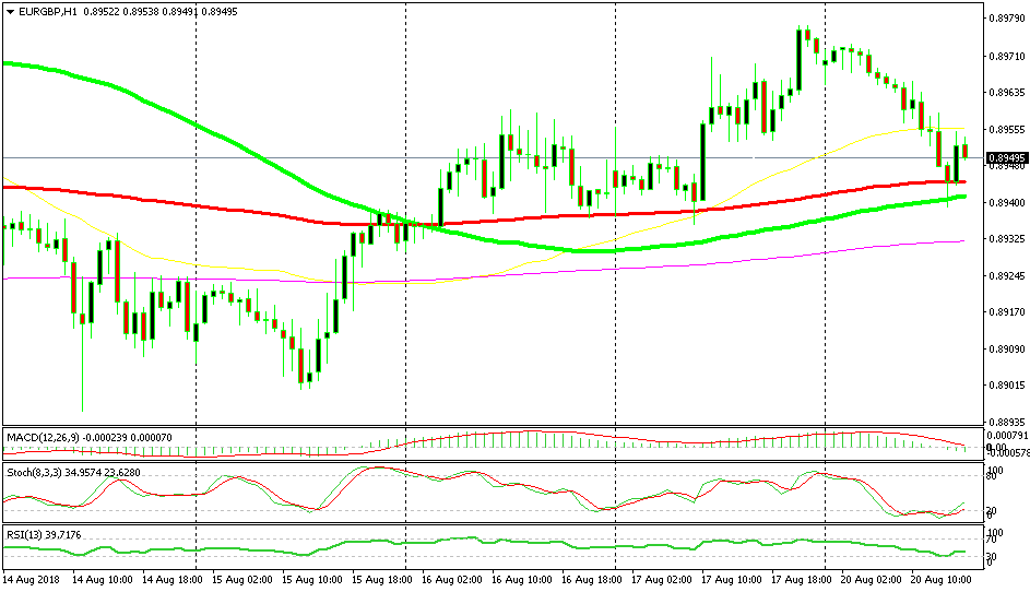 The major trend has been bullish for EUR/GBP, but the smaller timeframe trend used to be bearish two weeks ago. Although, the smaller trend turned bullish as well last week. Today in the European session, this pair was retracing down but it seems as the retrace is over now. The 100 SMAs (red and green) provided support and the stochastic indicator became oversold. Now the price is starting to reverse higher so we are at the beginning of the next bullish move.