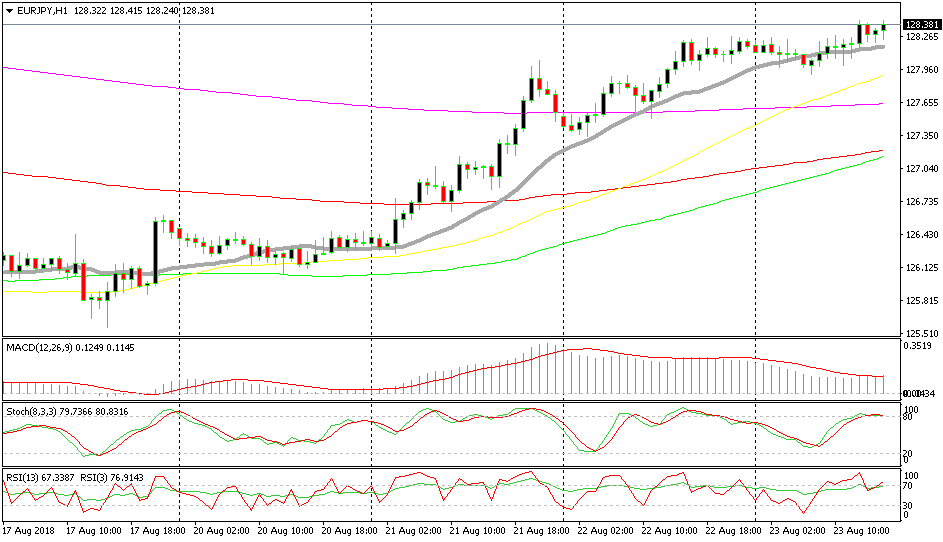 Two hours ago we opened a buy forex signal in EUR/JPY. This pair was finding strong support at the 20 SMA (grey) which means that the trend is pretty strong since the smaller moving averages have come into play. The previous hourly candlestick formed a small hummer when we took that trade. That means that the price was going to turn bullish after the small retrace down. The market sentiment has improved as well, which is bad for the JPY. That signal closed just a while ago so it is good that we took it.