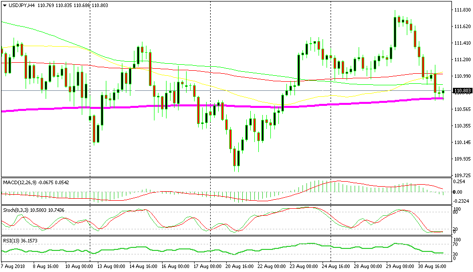 USD/JPY has lost more than 100 pips in the last two days, but the main trend is still bullish on the higher timeframe charts, which makes this just a retrace before the next bullish move. The retrace is complete now since stochastic is severely oversold and the 200 SMA (purple) has been providing solid support. The previous candlestick formed a doji which is a reversing signal, so this chart setup is pointing to a bullish reversal and we just went long on this pair.