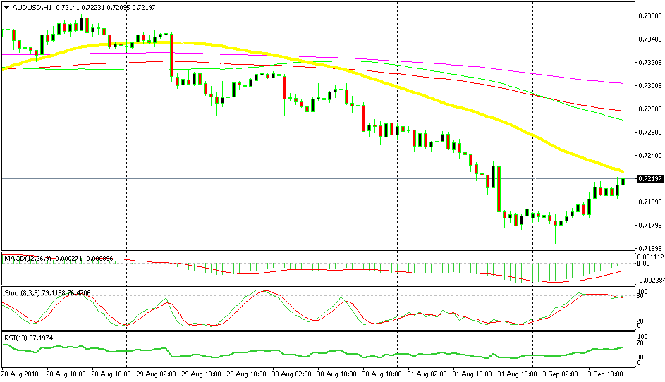 AUD/USD turned bearish last week as fundamentals deteriorated. Australia expelled the Chinese giant Huawei last week and the economic data has been pretty disappointing since then. So, AUD/USD has turned bearish. Although, this morning it has been retracing higher but it seems that the retrace looks compete now. The 50 SMA (yellow) is just standing above and it is providing resistance. So, we decided to go short on AUD/USD and it seems like the reverse is about to take place.