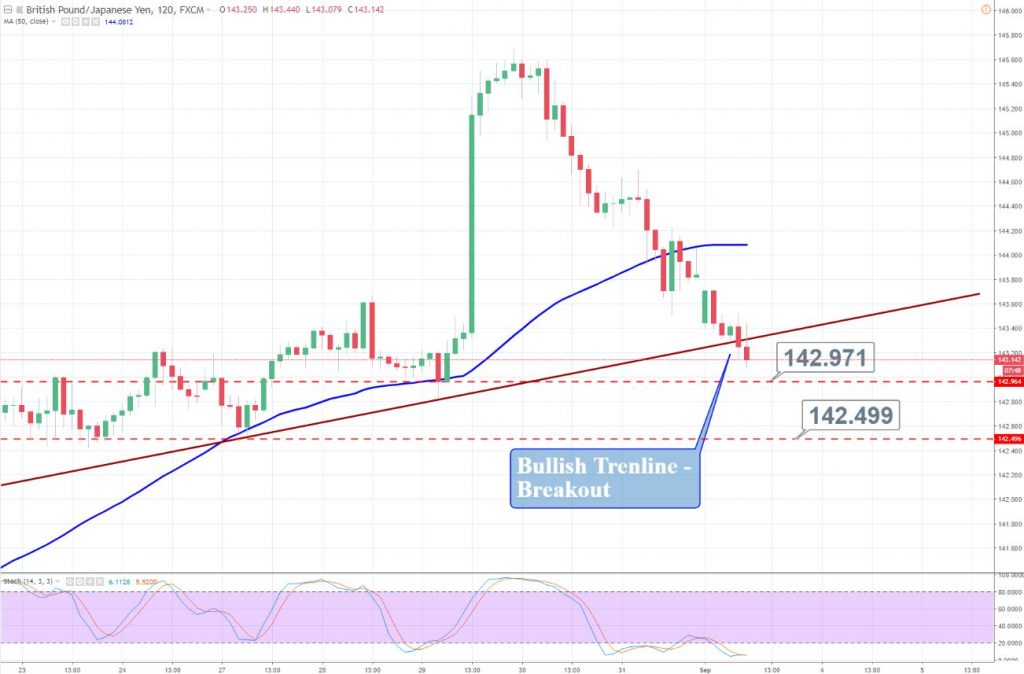 We have recently opened a sell signal on GBP/JPY as the Sterling is in selling after the news release. As you can see on the chart, the GBP/JPY has violated the bullish trendline support at 143.350 and the market can go after 142.950 and 142.450. The 50- periods moving average is also suggesting a selling bias of traders. Good luck!