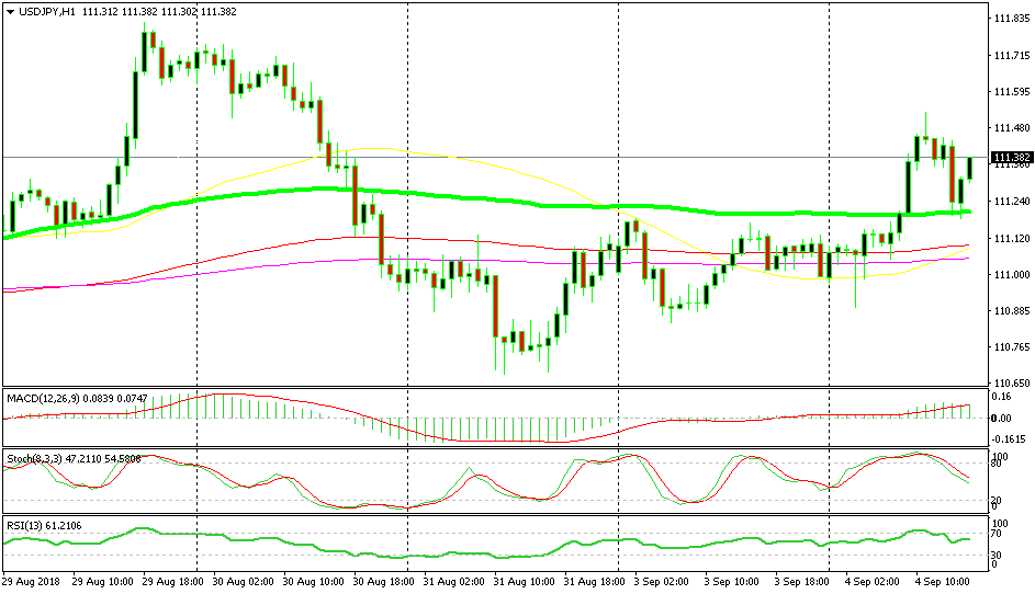 USD/JPY turned bullish last Friday after having traded in a bearish trend all week. But the 100 SMA (green) has been scaring the buyers off for the last few days. That moving average was broken this morning and it turned into support as USD/JPY retraced lower during the European session. It held the decline well and the price reversed after failing to break back below it. Currently, we are seeing the next leg of the uptrend.