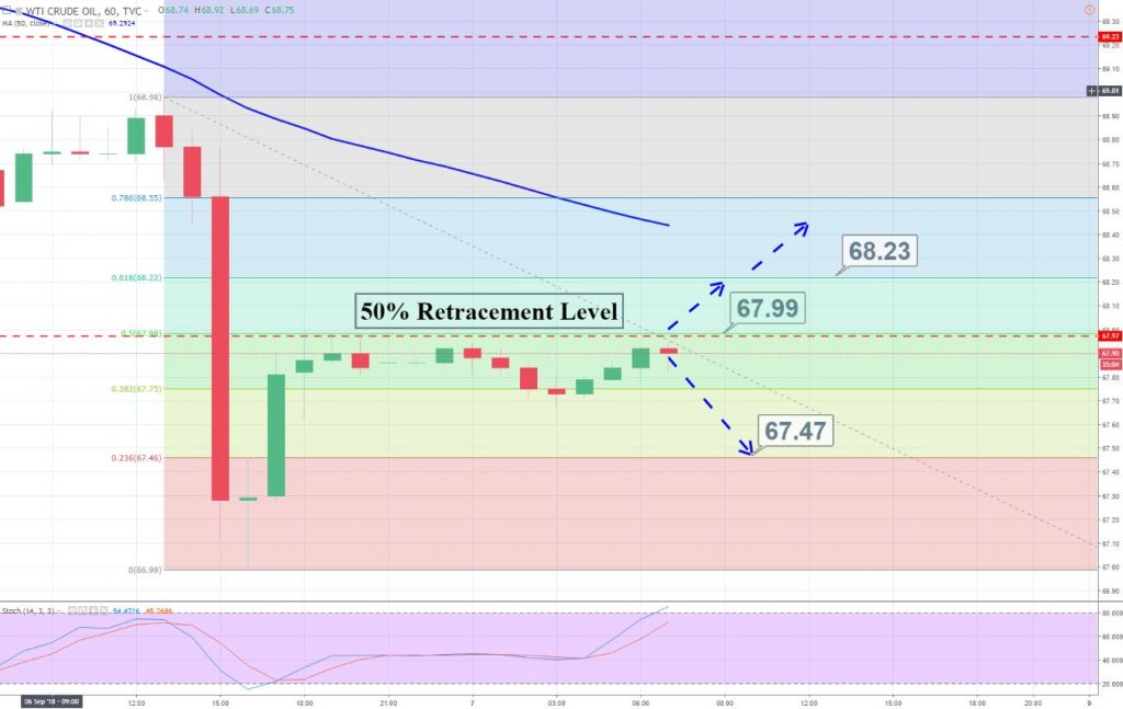 Oil prices are steady below $68 since the Asian session as the WTI has already completed 50% retracement. As you can see on the hourly chart, crude oil is forming doji and spinning top candles which are signifying that traders are confused about the next movement.