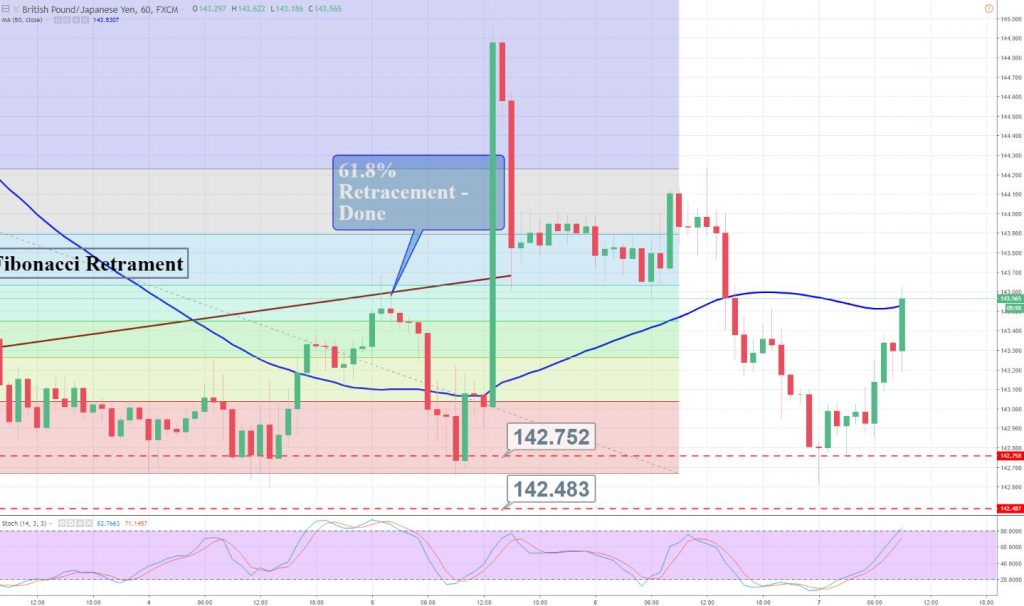 Looking at the hourly chart, the GBP/JPY is trading bullish at 143.450 due to weakness in the Japanese Yen. The RSI has a cross above 50 which means investors are trading with the bullish sentiment. However, the only hurdle is 50- periods EMA which is likely to provide it a strong resistance near 143.50. While our take profit is 143.550.
