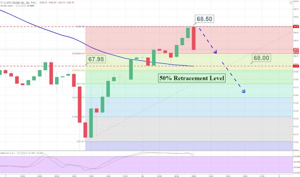 Technically, crude oil has formed a bearish engulfing pattern on the hourly chart which is suggesting a selling bias of traders. Crude has faced a nice hurdle up there at $68.50 and the RSI is overbought. It seems like oil is going for a retracement. So, the immediate support is likely to be at 38.2% Fibo level of $67.95 and 50% Fibo level of $67.75.