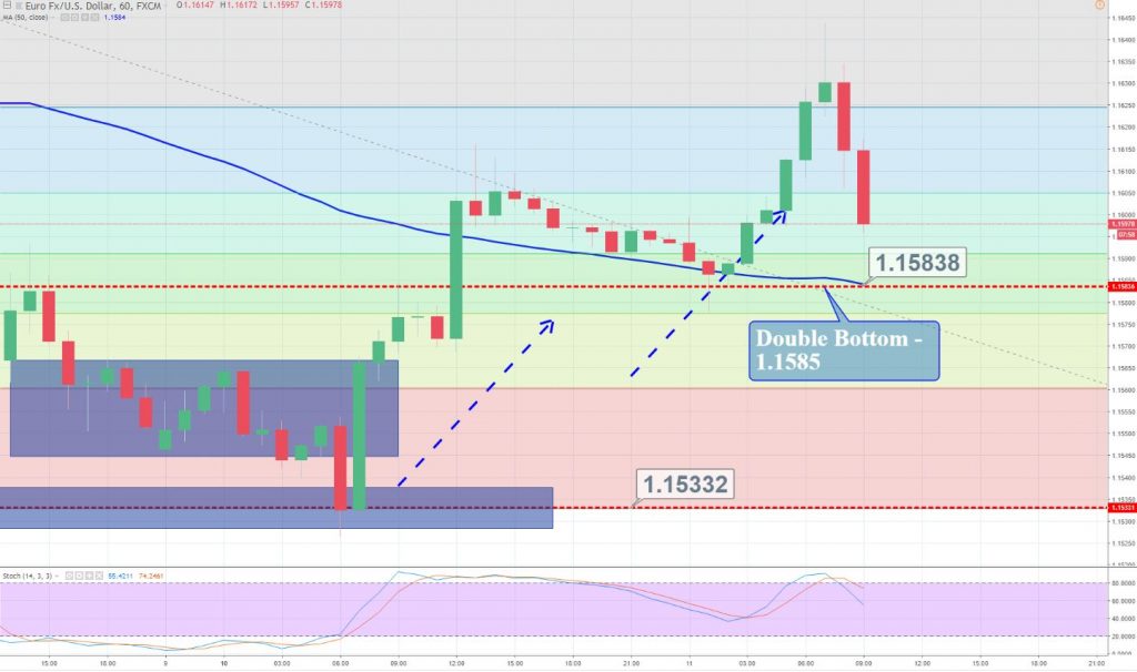Anyhow, I’m looking to take another buying position in the EUR/USD near $1.1580. As you can see in the chart, the 50 – periods EMA is likely to support the pair at $1.1585. The double bottom pattern is also likely to support the pair at the same level of $1.1585.