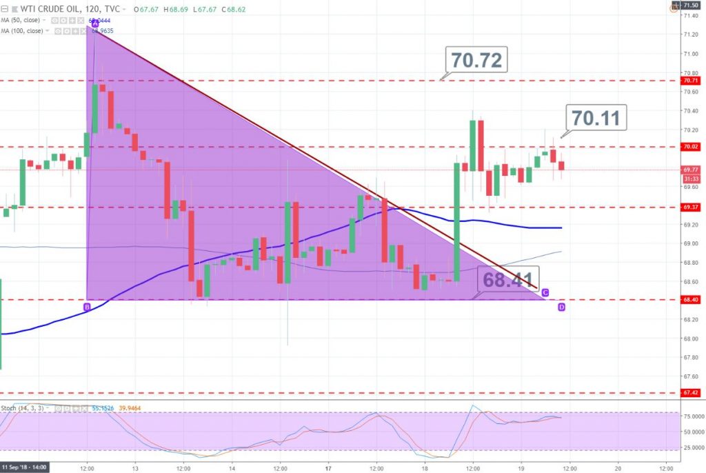 The technical side hasn’t changed much. Crude oil violated the descending triangle pattern which was proving $68.80 a strong resistance. It can drop to $69.30 for a slight correction, but the odds of a bullish trend still remains strong. WTI can face an immediate resistance near $70 and $70.75, while the support prevails at $69.40. Good luck!