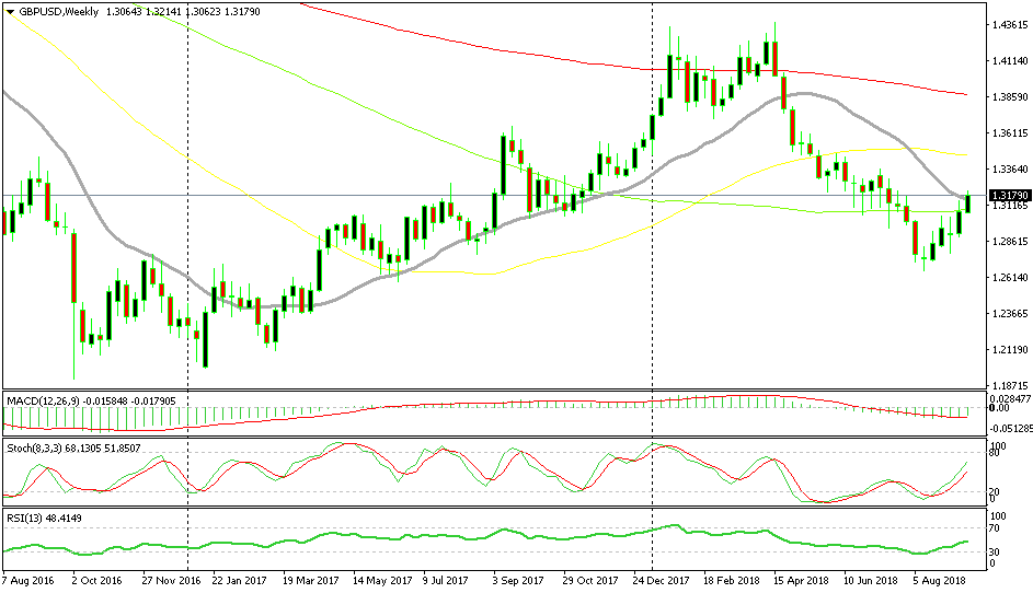 If we switch to the weekly chart, we see that the 100 SMA (green) has been broken this week. The 20 SMA (grey) has been pierced but the weekly candlestick must close above it to consider it as a proper break. The next moving average is the 50 SMA (yellow) which stands at 1.3460s. This moving average has provided support before so it is likely that it turns into support now.