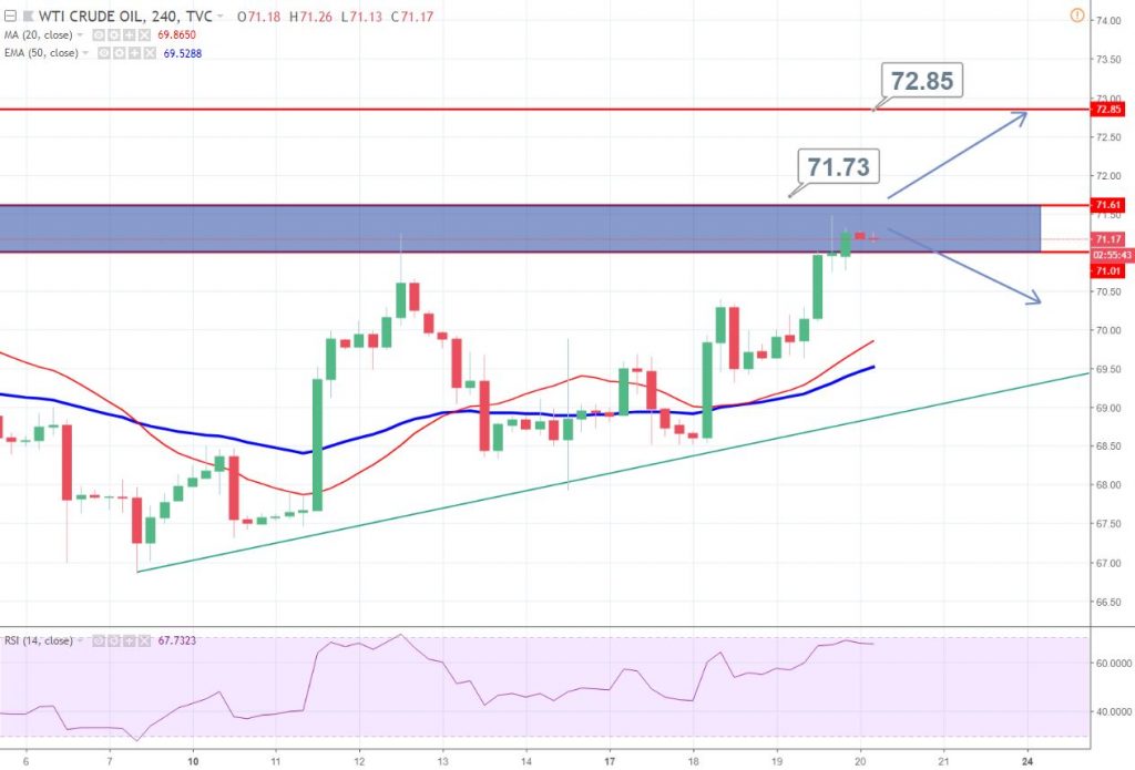 Crude oil is likely to face an immediate resistance near $71.65 and above this, oil can go for $72.75. Whereas, the bearish breakout of $71 can cause further selling until $70.25. Good luck!