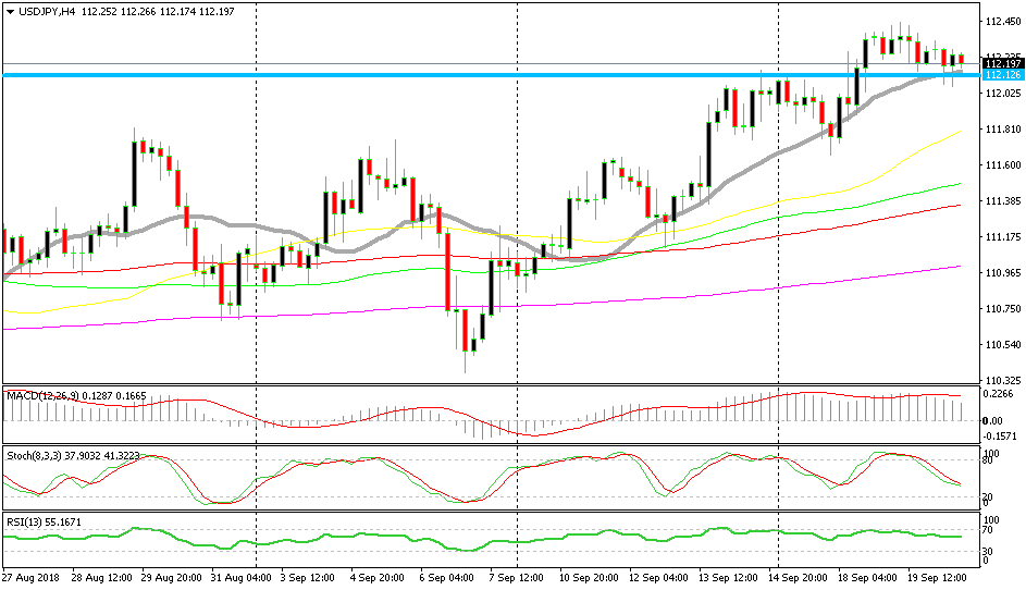 We just opened a buy signal in USD/JPY. The trend in this pair is bullish, so the bearish move today is just a retrace of the bigger uptrend. Stochastic is almost oversold, so the retrace is almost complete. Besides that, the 20 SMA (grey) is providing support at the bottom. The area around 112.00-10 used to be resistance, so now it has turned into support. The previous H4 candlestick formed a hammer which is also a reversing signal.