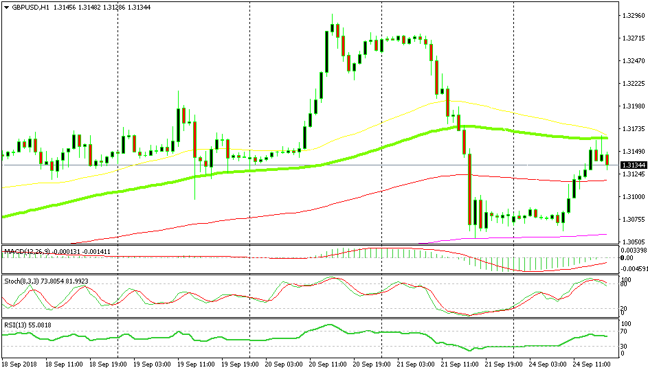 We just opened another sell signal in GBP/USD. This pair reversed to bearish last Friday after the Chequers plan failed, but it has retraced higher today. Although, the retrace seems complete now as stochastic is oversold on the H1 chart. The 100 SMA (green) is also providing solid resistance on top, helped by the 50 SMA (yellow) as well. The previous candlestick closed as an upside-down hammer which is another reversing signal.