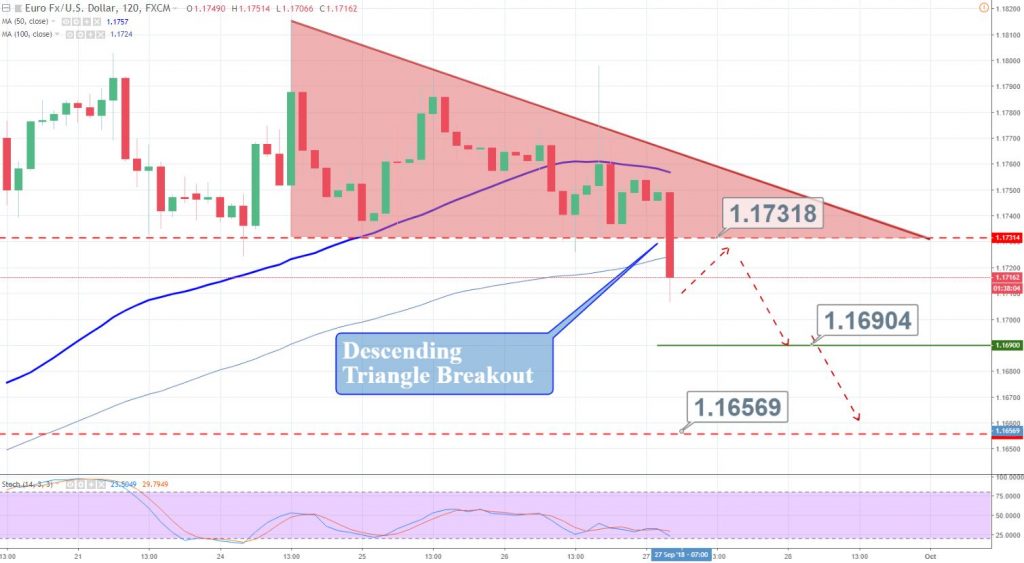Recently, we have a bearish breakout in the EUR/USD and it can be a good opportunity to short the pair. As we can see from the 2-hour chart, the EUR/USD was consolidating in a descending triangle pattern which supported the pair above $1.1730.
