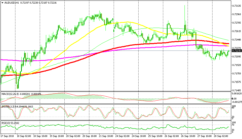 AUD/USD has turned pretty bearish this week as did all other risk currencies. Today though, we are seeing a bullish retrace higher which seems pretty weak to me. The stochastic indicator is almost overbought and the price is still some distance away from the batch of moving averages. These moving averages have turned into resistance now that they have been broken. The 50 SMA (yellow) is quickly catching up, so once it reaches the price, we will try to open a sell forex signal in this pair.
