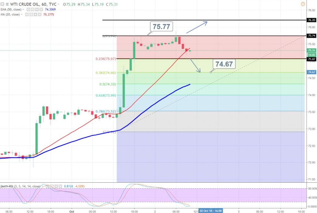 WTI crude oil broke out of the sideways range of $75.35 – $75.77 to reach rising levels not seen since November 2014. It’s all because of the same sentiments we were discussing before.