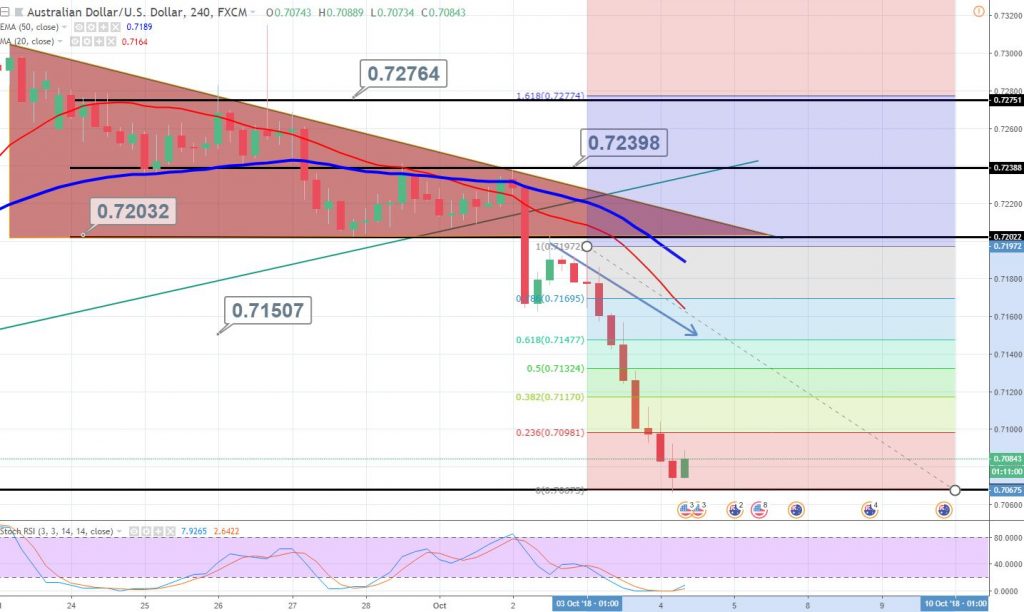 The AUD/USD plunged sharply to trade near $0.7070 over a stronger dollar. As we discussed earlier, the US non-manufacturing and ADP employment figures were phenomenal. Which cause a bearish breakout on the descending triangle pattern and dragged the AUD/USD pair lower to 0.7065.