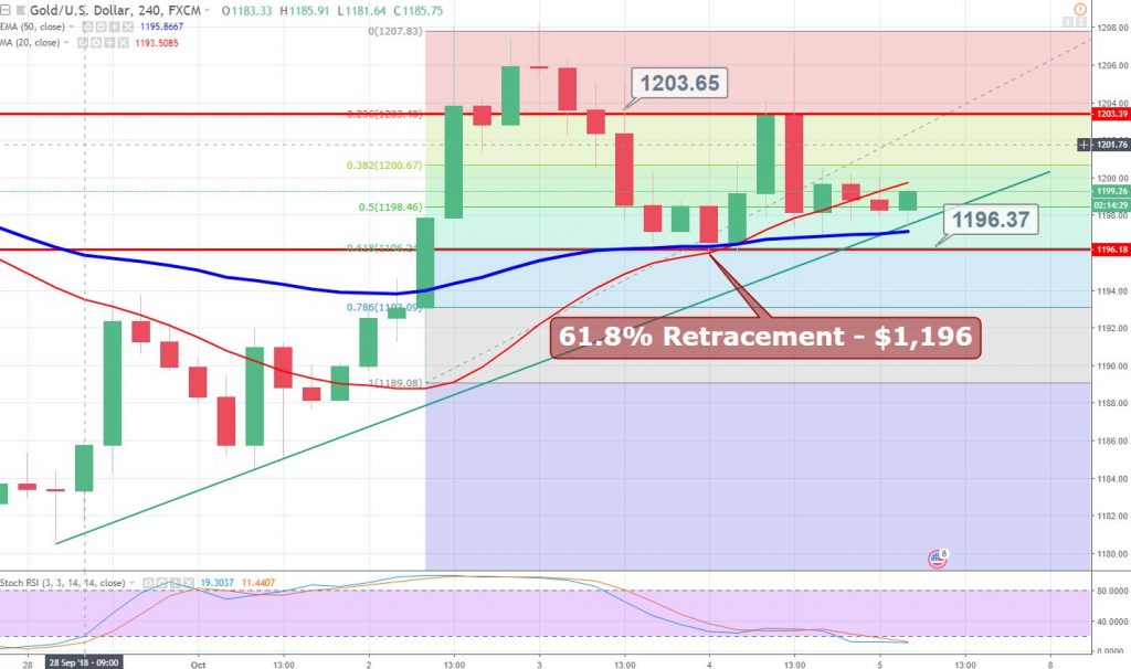 Gold completed 61.8% retracement at $1,196. 50 periods and the 50 periods EMA is also supporting the yellow metal at $1,196...