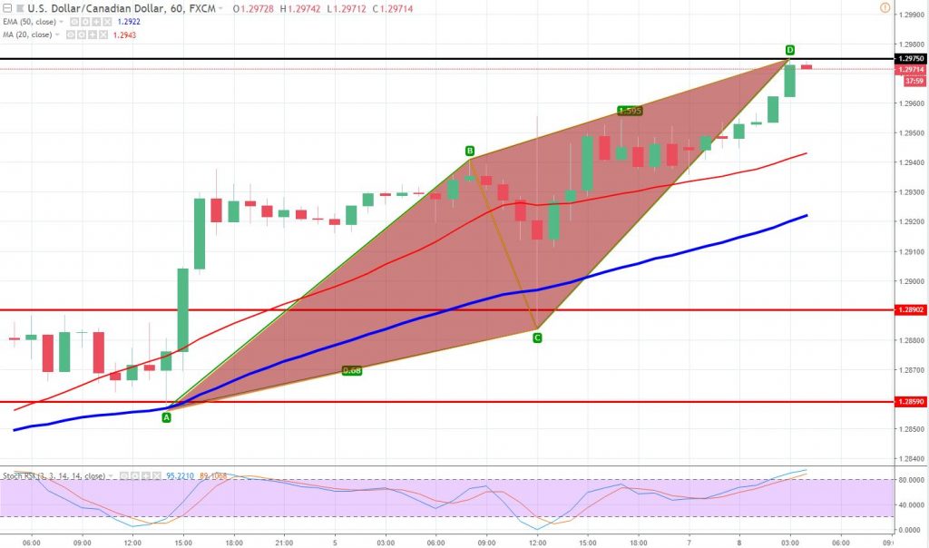 On the hourly chart, the USD/CAD soared dramatically to complete the ABCD pattern at $1.2975. The ABCD pattern historically drives bearish moves in the market.