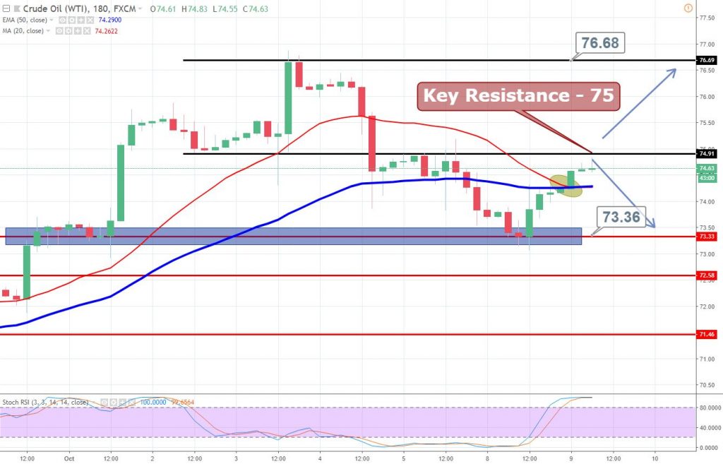For the moment, the immediate resistance prevails at $75 and crude oil can stay bearish under it. Whereas, the bullish breakout can lead oil prices towards $76.65. On the lower side, crude can face can find support above $73.35. Good luck!