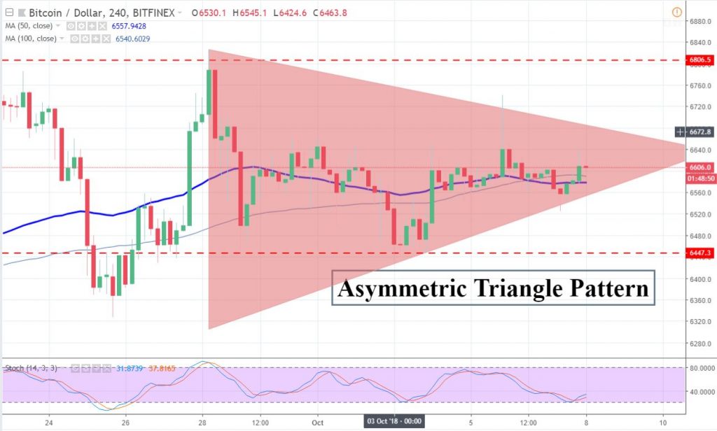 BTC/USD continues to trade sideways in a very thin range of $6,500 – $6,800, in an asymmetric triangle pattern. This pattern represents indecision between bulls and bears and can breakout either side. However, the trading sentiment still remains bullish in the longer run. Check out the weekly trading levels on cryptocurrencies.