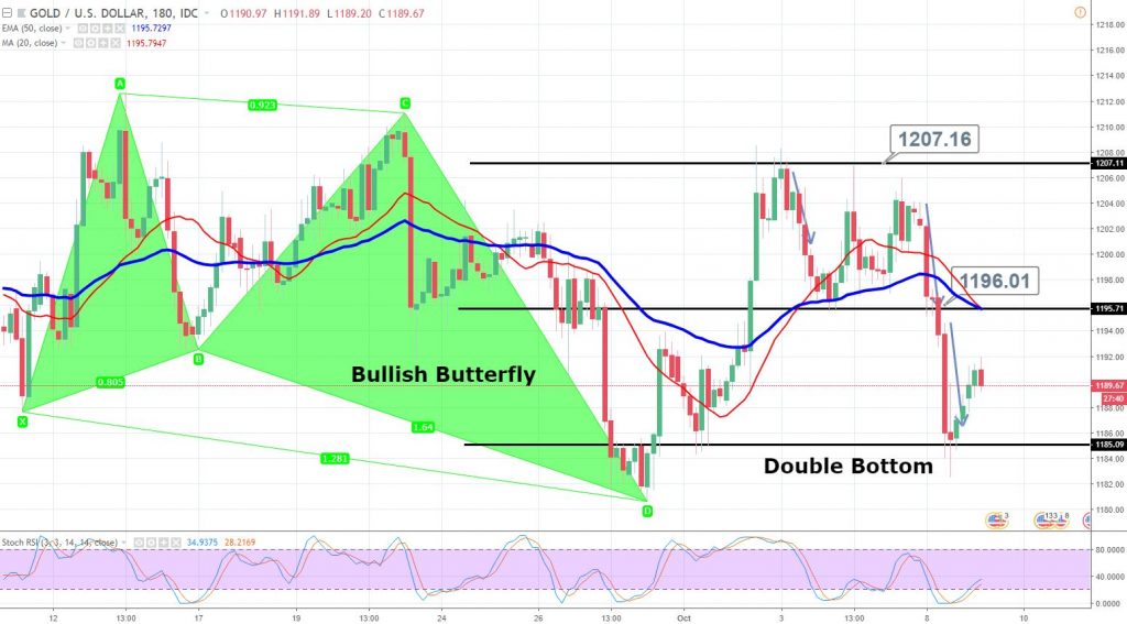 For now, the immediate support prevails at $1,182 along with a resistance near $1,195. The market can give us an opportunity to sell below $1,195 and buy above $1,182. Good luck!