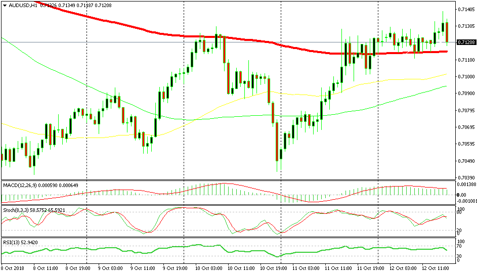 AUD/USD has shifted to bullish in the last several days. The 100 SMA (red) was providing resistance on Wednesday but it has now turned into support after getting broken yesterday. If the price slips down to the 100 SMA now, I might be lured to open a buy signal against it. The main trend is still bearish on the daily chart, but at the moment, AUD/USD is making a retrace higher and there is still more room until it reaches the declining 50 SMA which has pushed this pair lower.
