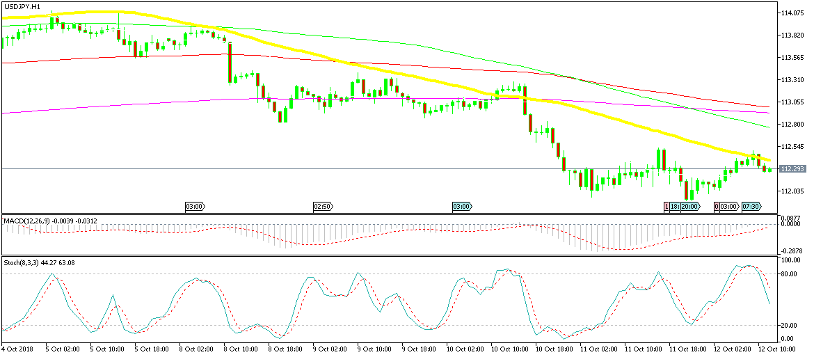 So, the trend has shifted to bearish for USD/JPY and it has lost more than 250 pips from top to bottom. It bottomed out yesterday though as this forex pair reached the 200 SMA (purple). Since then, we have seen USD/JPY retrace higher but another moving average is capping the retrace from above.