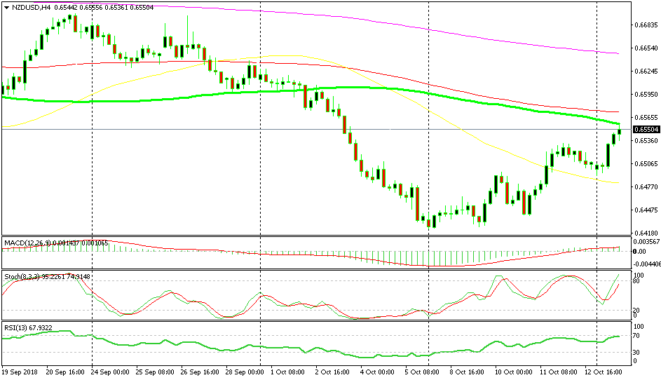 NZD/USD has been moving higher in the last several trading days, but this is just a retrace of the bigger trend which is still bearish. The retrace seems complete on the H4 chart now as the stochastic indicator is overbought on this timeframe. Besides that, the 100 SMA (green) is providing resistance on the top side, so it looks like a good opportunity to go short on NZD/USD.