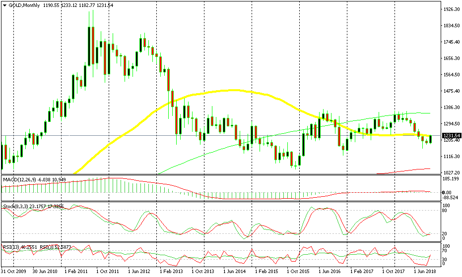 Although, if we switch to the monthly Gold chart, we see that stochastic is oversold and it is just turning higher. But, we still have another moving average here which is standing right above the current price. That moving average is the 50 SMA (yellow) and it comes at the same level as the 200 SMA on the weekly chart.