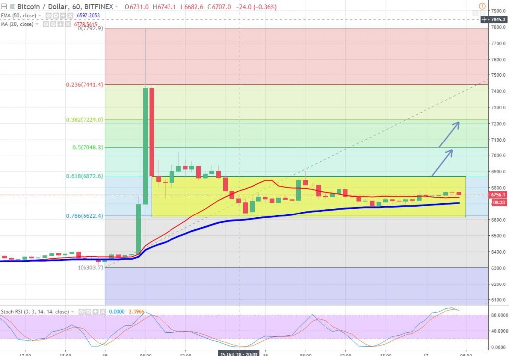 The BTC/USD jumped dramatically on Monday to place high of $7,790 but reversed before meeting our take profit level of $9,900. For the moment, the BTC/USD has completed 78.6% retracement at $6,620 and the pair is still holding above it. Good thing is, the pair is still trading above 20 & 50 periods EMA which is signaling a bullish bias of traders.