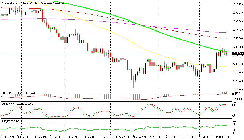 According to that chart, we should see Gold resume the downtrend now. But let’s see what the weekly chart looks like. On this timeframe chart, we have the 200 SMA (grey) providing resistance at the top. It provided resistance last week and it held its ground this week as well, as the price returned back below it after piercing it for a moment.