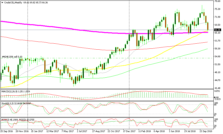 EUR/GBP has turned bullish in the last couple of weeks and yesterday we decided to go long here as this pair was retracing lower to the 50 SMA (yellow). Today, this pair retraced back lower after the soft manufacturing and services numbers from Europe. But, the 200 SMA (purple) has been providing support and is not letting go. Now, the 100 SMA (green) has caught up with the price as well, adding more strength to the support area. The stochastic indicator is almost oversold which means that the retrace down will be over soon and the previous candlestick formed a doji, which is a bullish reversing signal.