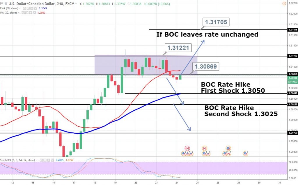 The USD/CAD is holding in the tight range of $1.3070 – $1.3115 as the investors are in a state of indecision. The uncertainty is caused by the Bank of Canada which is widely expected to hike the interest rates by 25 base points.