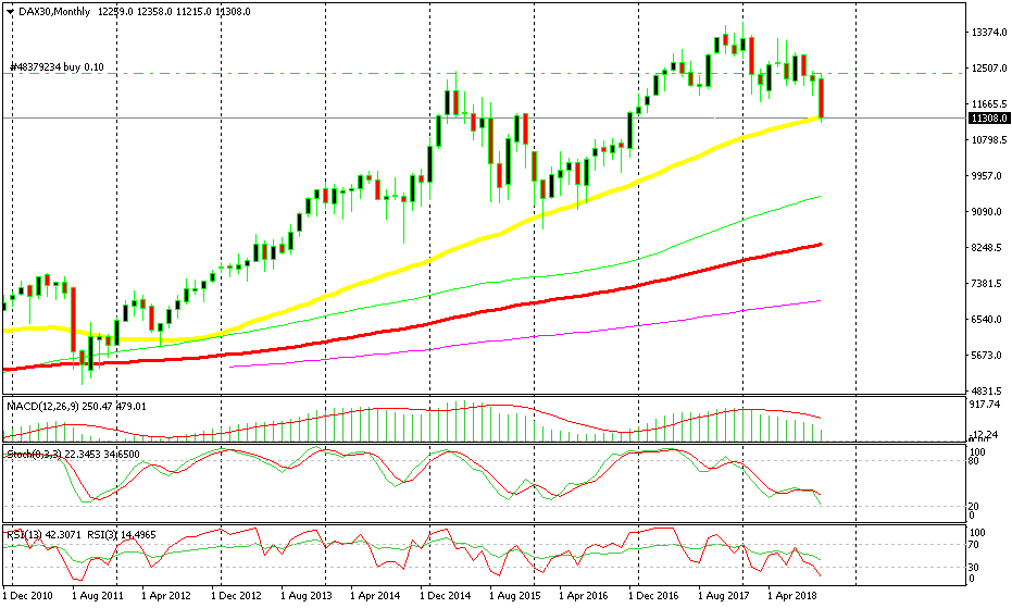 Stock markets have shifted from the bullish trend we have seen in the last several years. They have entered a bearish trend, albeit, the trend on the monthly chart is still bullish as we will see further below in the DAX chart.