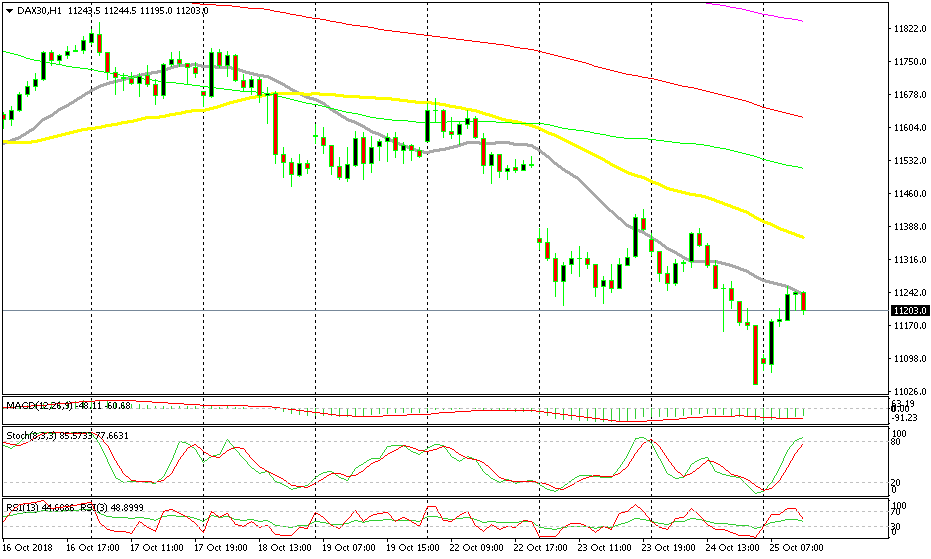 Stock markets have been on a solid downtrend in the last few months and yesterday, they made new recent lows. Although, they have been retracing higher today and DAX seems to have completed the retrace. The stochastic indicator is overbought, and the 20 SMA (grey) is providing resistance. The previous candlestick also closed as a pin which is a reversing signal and now it seems that the reversal is happening. We might open a sell signal here soon.