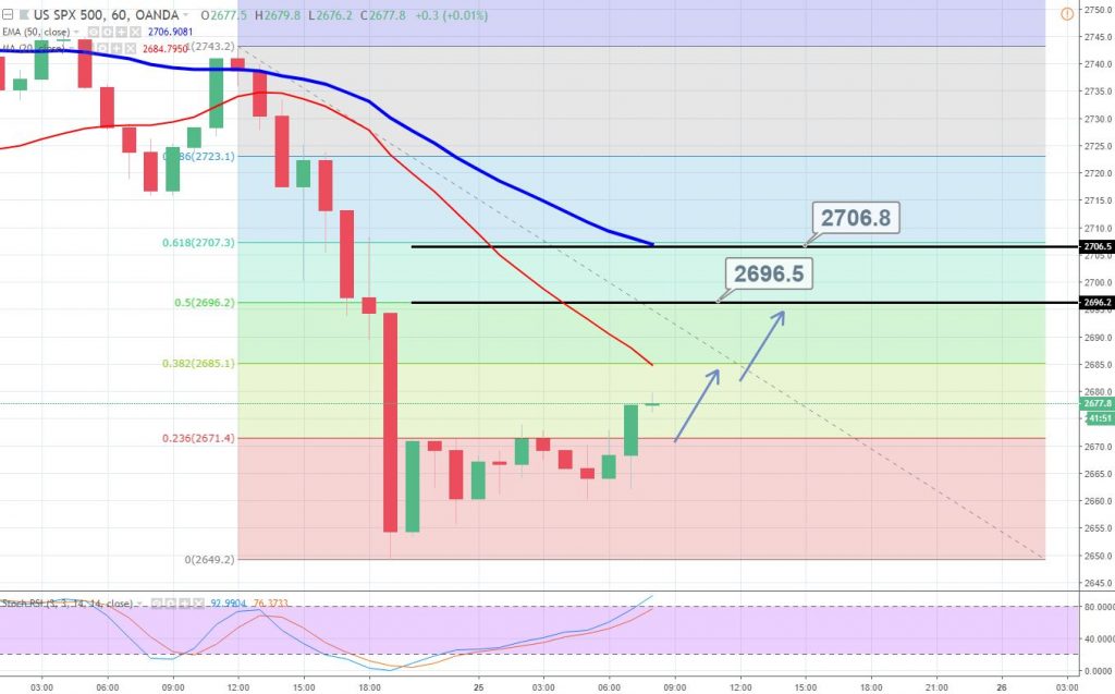 The S&P500 is coming out of the oversold zone, as you can see on the hourly chart below, the RSI is crossing above 50. This indicates the potential of a bullish reversal and that’s exactly we are trying to capture. SPX can find an immediate resistance at $2,685 (38.2% Fibo Level) and $2,696 (50% Fibo Level). Fellas, in between $2,685 and $2,696, the S&P500 can face a strong resistance at $2,690.