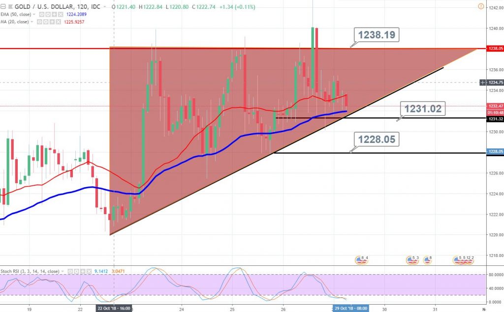 On the 2- hour chart, gold is testing $1,232 probably for the sixth time since Oct 18 and now it seems to violate this level as bears seem..