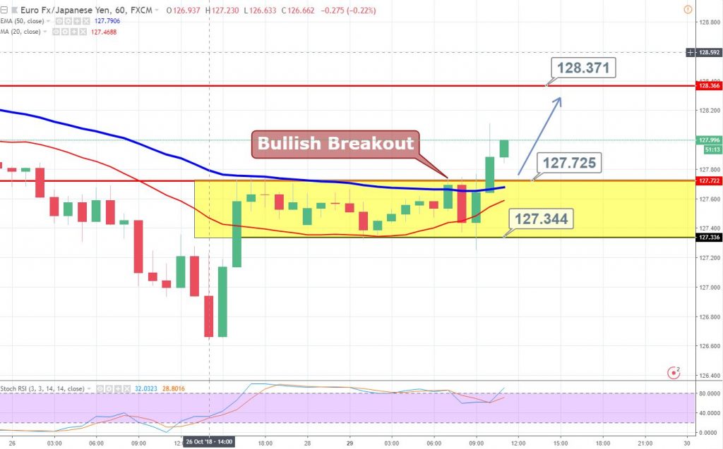 - On the hourly chart, the EUR/JPY has come out of the sideways trading range of 127.350 – 127.725.