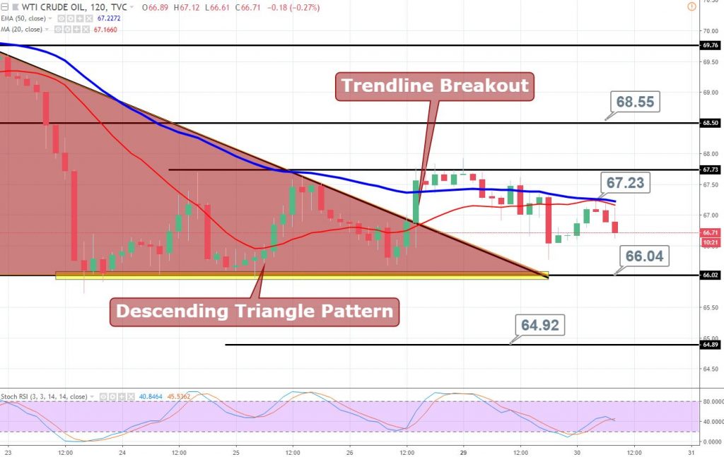 The WTI is likely to stay bearish below $67.25 to target $66. While the bearish breakout of 66 can lead the prices towards $64.85.