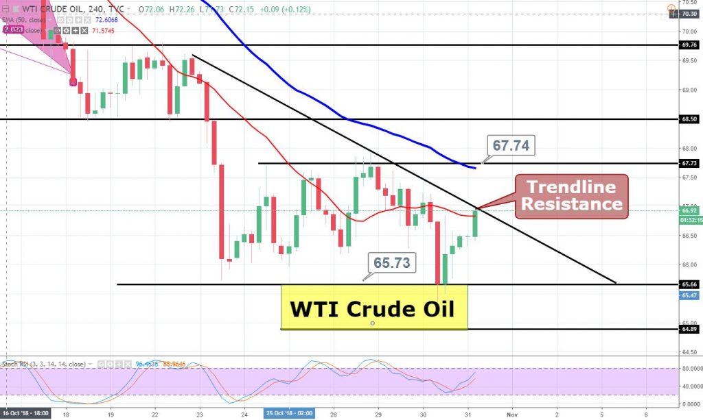 Looking at the technical side, crude oil is facing a solid resistance near $67. The 20 periods MA is blocking its way to the upside. While the support remains at $65.65.