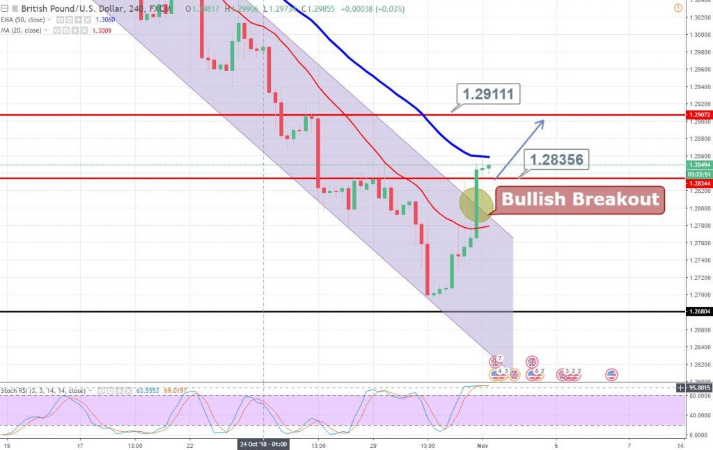 On the 4 -hourly chart, the cable violated the psychological resistance level of $1.2800 to come out of the bearish channel. Looks like the pair is taking a bullish reversal, however, we can’t say much until the release of monetary policy from the Bank of England.