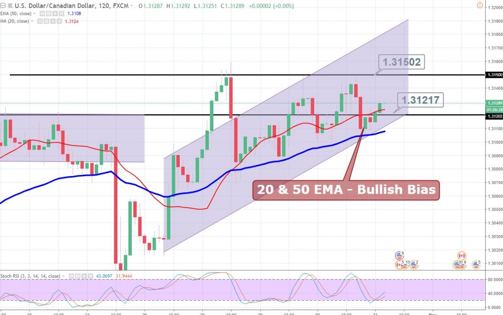 At the moment, the USD/CAD is trading in a bullish channel which is supporting the pair near $1.3150 along with a resistance at $1.3175. The 20 and 50 periods EMA are also supporting the bullish trend of the pair.