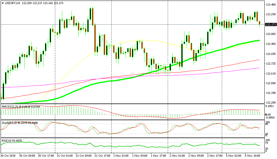 USDJPY has turned bullish again after the bearish retrace at the end of last week due to trade adjustment before the US midterm elections. So, USD/JPY has resumed the uptrend which it started at the end of the previous week. But, we are going to go long in this pair just yet, we will wait for the retrace to be over on the H1 chart as well. Maybe the retrace will end by the time the moving averages catch up with the price.