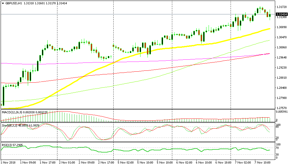 GBP/USD reversed the bearish trend last week and has entered a bullish period, climbing nearly 500 pips during this period. It is slightly retracing now after the surge on US election results, but the retrace is much smaller than in other pairs, so the buying pressure is still on. We are thinking of buying this pair when the price reaches the 50 SMA (yellow). By that time, stochastic will be oversold which means that the retrace will be complete.