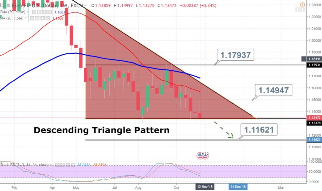 Recalling FX Leaders Weekly Update, Nov 12 – 16, the EUR/USD seems to trade in line with our forecast. The pair is peaking out of a descending triangle pattern, violating the pattern at $1.1335. The pair may remain in selling below $1.13350 until $1.1250 and $1.1165.