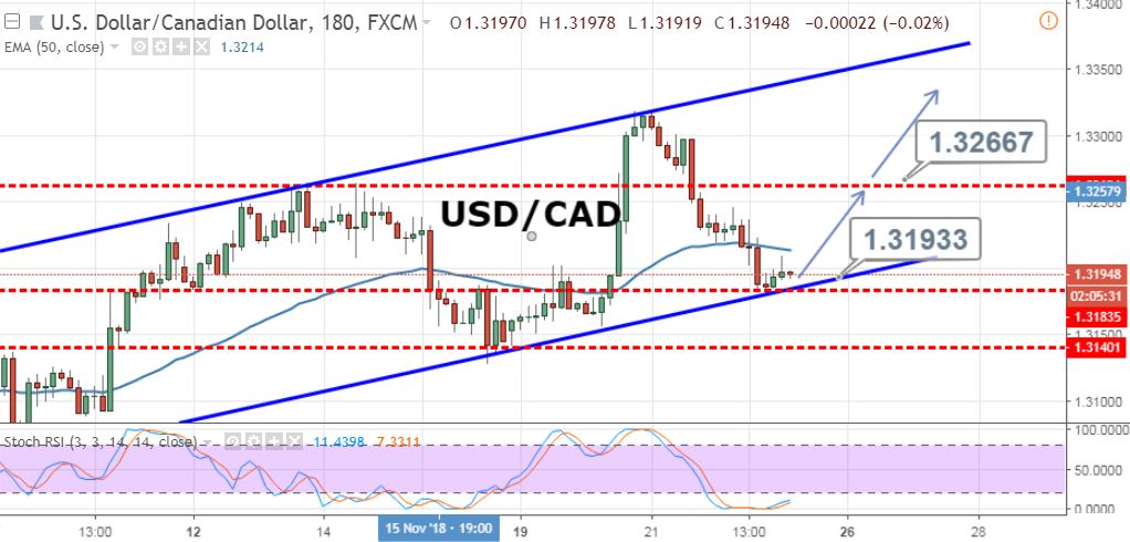 The USD/CAD plunged to $1.3190 to trade in the oversold zone. For now, the bullish trendline is extending a strong support to USD/CAD at $1,3180. In fact, the pair is trading in a bullish channel on the 3- hour chart. On the violation of $1.3180, loonie can go after $1.3160.