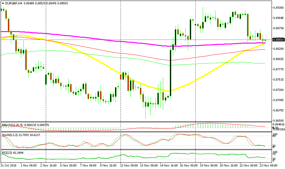 EUR/GBP turned bullish last week as Brexit became more complicated and the GBP declined, but it slipped lower yesterday as the GBP surged higher on positive Brexit rumors. That decline has brought the price in EUR/GBP to 0.8850s where we can find the 200 SMA (purple) and the 50 SMA (yellow). They are both providing support to this pair which is now oversold as the stochastic indicator shows, so the bearish retrace is complete for EUR/GBP. Besides, the previous candlestick closed as a doji/spinning top, which is a bullish reversing signal after a bearish retrace.