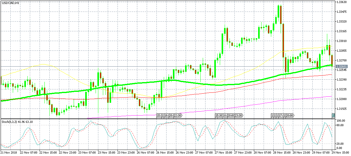 We went long on USD/CAD earlier today. This pair has been on a bullish trend sine the beginning of October, although the uptrend hasn’t been very strong. The OPEC+ meeting is coming and Oil has been feeling pretty weak with US WTI crude Oil declining below $50. So, the CAD has been suffering because of this, but yesterday, USD/CAD reversed lower on Powell’s comments. Today we are seeing another bearish move, but the uptrend remains in place and the 100 SMA (green) is providing support to this pair, so we decided to open a buy forex signal.