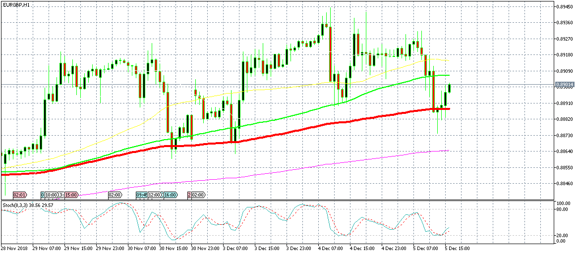 Yesterday we went long on EUR/GBP from the 100 simple MA (green). That proved to be a good trade as that moving average reversed the price, but the 100 smooth MA (red) is the ultimate support indicator for this pair. Today, the price dipped again and it reached the 100 smooth MA as GBP surged on ‘no Brexit’ rumours. The 100 SMA provided solid support once again and the candlestick formations pointed to a bullish reversal. But, we missed the opportunity. Although, this move is still not over as it has lots of room left to run higher.